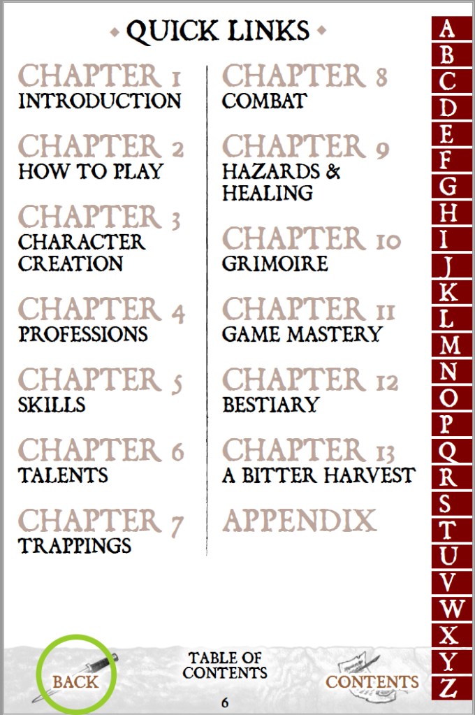 With this in mind, every single page of the rulebook has a snappy little link to the index running down the side. Want to check out the rules for a critical success? Tap ‘C’, tap the entry and you’re on the right page. Want to peruse the bestiary? Just pop open the table on contents, tap the link and get scrolling.